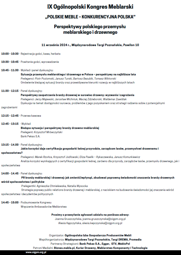 Więcej informacji i zgłoszenia w biurze Ogólnopolskiej Izby Gospodarczej Producentów Mebli: