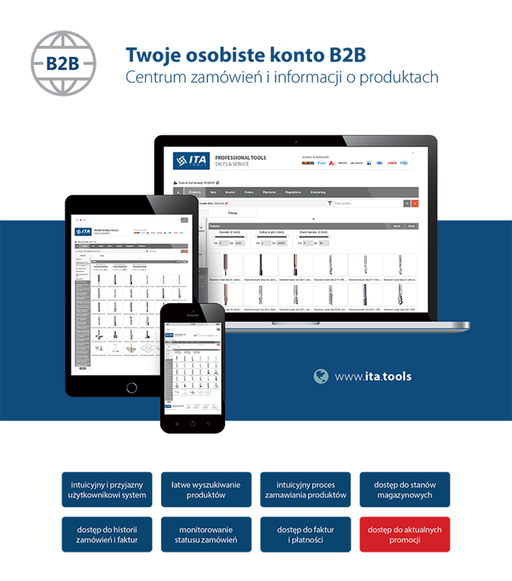 Nowoczesny system B2B pozwala na pełną automatyzację zamówień narzędzi do zakładu, kontroli kosztów, realizacji zamówień i dostęp 24/h do oferty narzędzi. Centrum zamówień i informacji o produktach w ramach osobistego konta B2B umożliwia dostęp w jednym miejscu do szerokiego asortymentu narzędzi. Standardowe rozmiary i rodzaje narzędzia są zawsze na stanie magazynowym i w każdej chwili mogą być dostarczone pod wskazany adres. Dzięki temu nie trzeba inwestować w utrzymanie własnego magazynu narzędzi. Osobiste konto B2B umożliwia dostęp do stanów magazynowych, cen i zamówień przez całą dobę, 7 dni w tygodniu. To spore ułatwienie i automatyzacja dla działu zakupów, dające łatwy wgląd w historię zamówień, faktury i bieżące promocje.