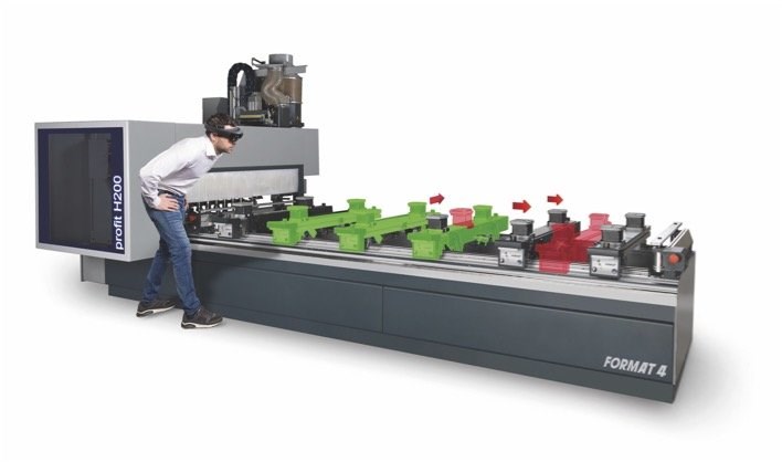 Z kolei nowość F4Vision wprowadza nowy, wirtualny wymiar w obróbce drewna. Jako opcja oprogramowania sterującego obrabiarkami CNC od Format4 w połączeniu z okularami z technologią Augmented Reality czyli rozszerzonej rzeczywistości stanowi ogromną pomoc dla operatora podczas obsługi maszyny, jak również interaktywnego wsparcia serwisowego. W tak zwanej „Mixed-Reality“, która jest tworzona przy pomocy okularów AR, wirtualne elementy zostają zintegrowane z realną rzeczywistością. Dzięki temu operator widzi przed sobą rzeczywistą przestrzeń, która jest uzupełniona wizualnie przez elementy graficzne. W trakcie przygotowania CNC operator widzi dokładnie obliczone pozycje przyssawek oraz konsoli i potrafi je zgodnie z tym ustawić.