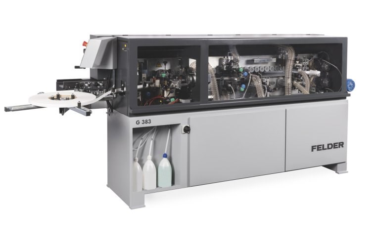 Do atutów nowej okleiniarki G 383 z pewnością należy monitor dotykowy. Z jego pomocą w łatwy i przejrzysty sposób włączane i wyłączane są poszczególne agregaty maszyny. Umożliwia on również ustawianie temperatury kleju, temperatury w trybie pracy i czuwania, posiada licznik metrów bieżących, wyświetla interwały konserwacji i czytelne komunikaty o błędach. Do wyposażenia standardowego G 383 należy także agregat frezowania wstępnego oraz agregat zaokrąglania naroży, a do obróbki końcowej można ją wyposażyć w dodatkowe agregaty takie jak cyklina profilowa, płaska lub polerka, a to wszystko mieści się w maszynie, która do ustawienia potrzebuje zaledwie 3,6 metra.